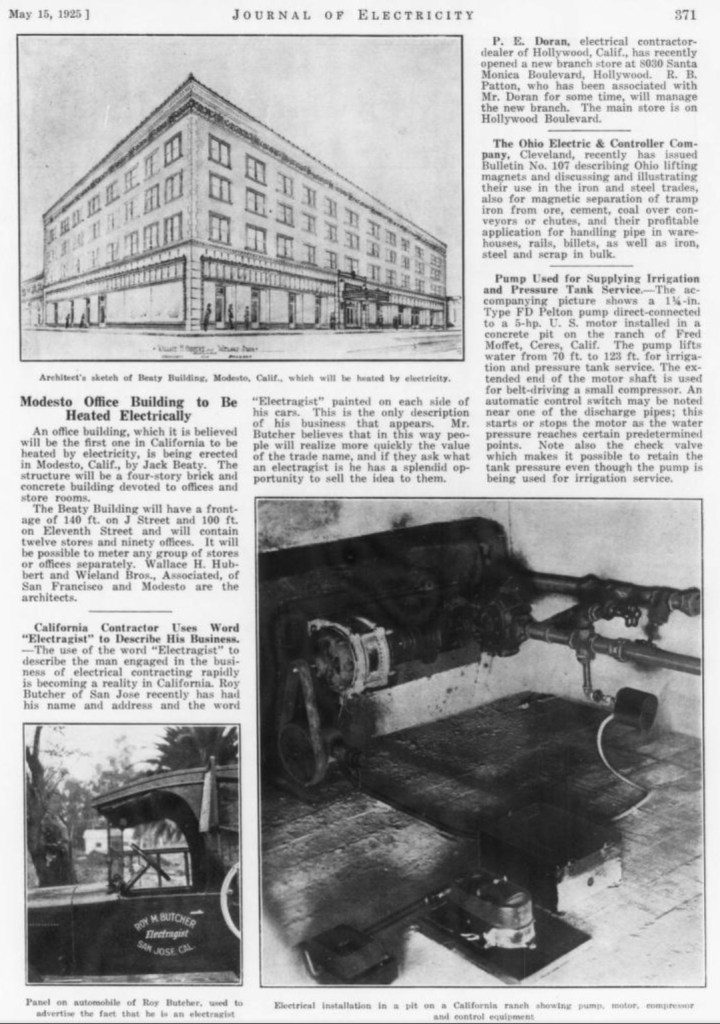 En 1925, el Journal of Electricity presentó el Beaty Building de Modesto en un artículo sobre el primer edificio de oficinas en el estado calentado por electricidad.