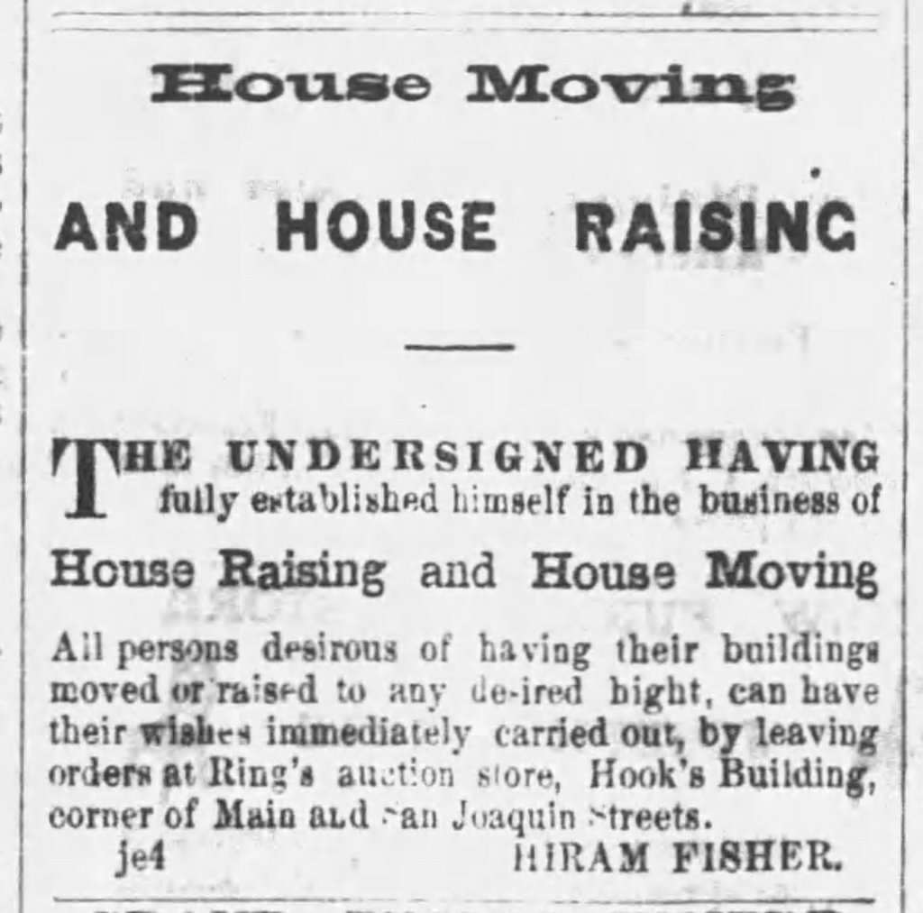 Confusion over the name did not delay the development of the town. Even before the line was completed to Modesto, residents of Tuolumne City and Paradise had arranged to have their houses and commercial buildings moved to the new town (4). Many hired Hiram Fisher of Stockton to do the job. (5) According to the Tuolumne City News, the first building, a hotel kitchen (6), made the journey on October 29th. Over the next month, dozens of buildings were moved to Modesto and by mid-December the boom town had more than 75 buildings (7). Regular railroad passenger service began on November 8th (8). The Tuolumne City News moved to Modesto and became the Stanislaus County Weekly News with the first issue dated December 2, 1870.