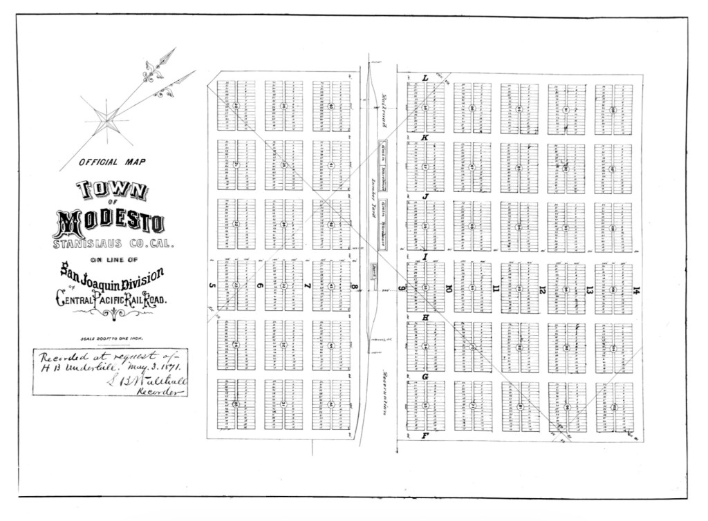 At this point, we may never know why the Central Pacific Railroad chose the site they did for Modesto. Perhaps it was enough incentive that part of the townsite included land it correctly thought it would acquire through two federal railroad land grants (1). About October 10, 1870, the railroad’s agent, the Contract and Finance Company, purchased 400 acres (2) in the area: 80 acres from Archibald Maze, 160 acres from John Atherton, and 160 acres from Solomon Albaugh. However, the map they filed with the county of the first townsite on May 3, 1871, was much smaller, about 230 acres. It covered the area from 5th to 14th street and from F to L street and was about half from the land grants and half from parts of the properties purchased from Maze, Atherton, and Albaugh.